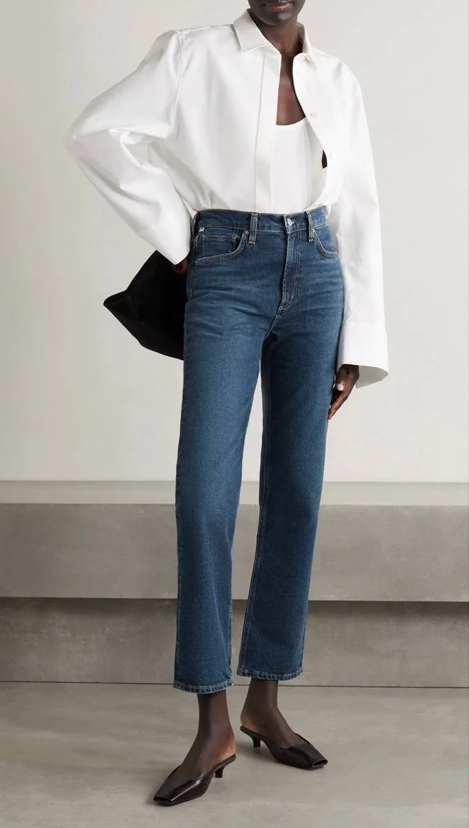 A pair of flattering, high-quality blue jeans is a must. Lean towards a straight or slim fit in a medium wash that you can dress up or down.